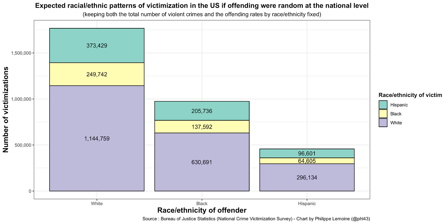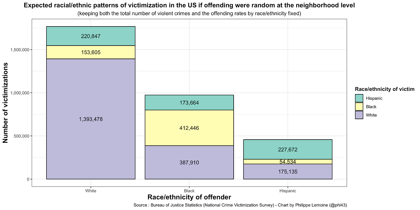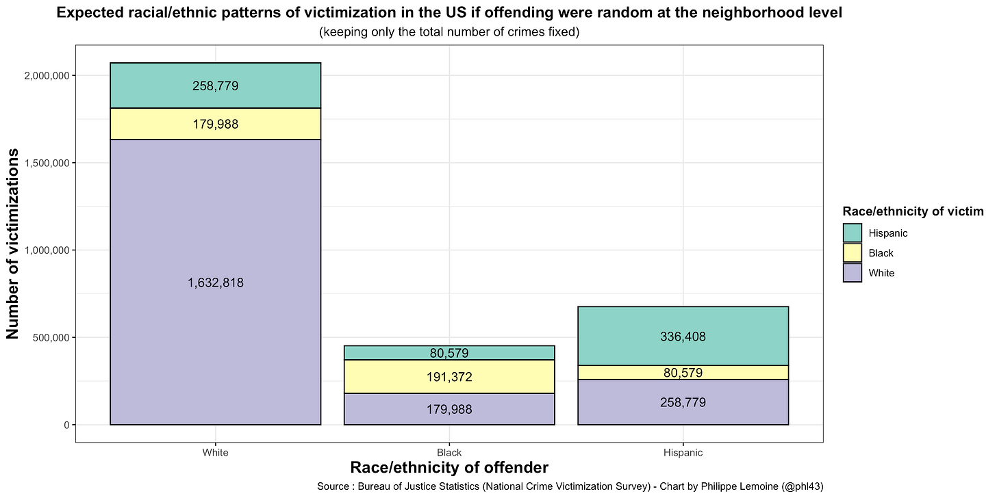 Here is what racial/ethnic patterns of victimization would look like in a counterfactual where, keeping the offending rate of each racial/ethnic group constant, criminals select their victims randomly with probabilities equal to each racial/ethnic group’s share of their neighborhood: