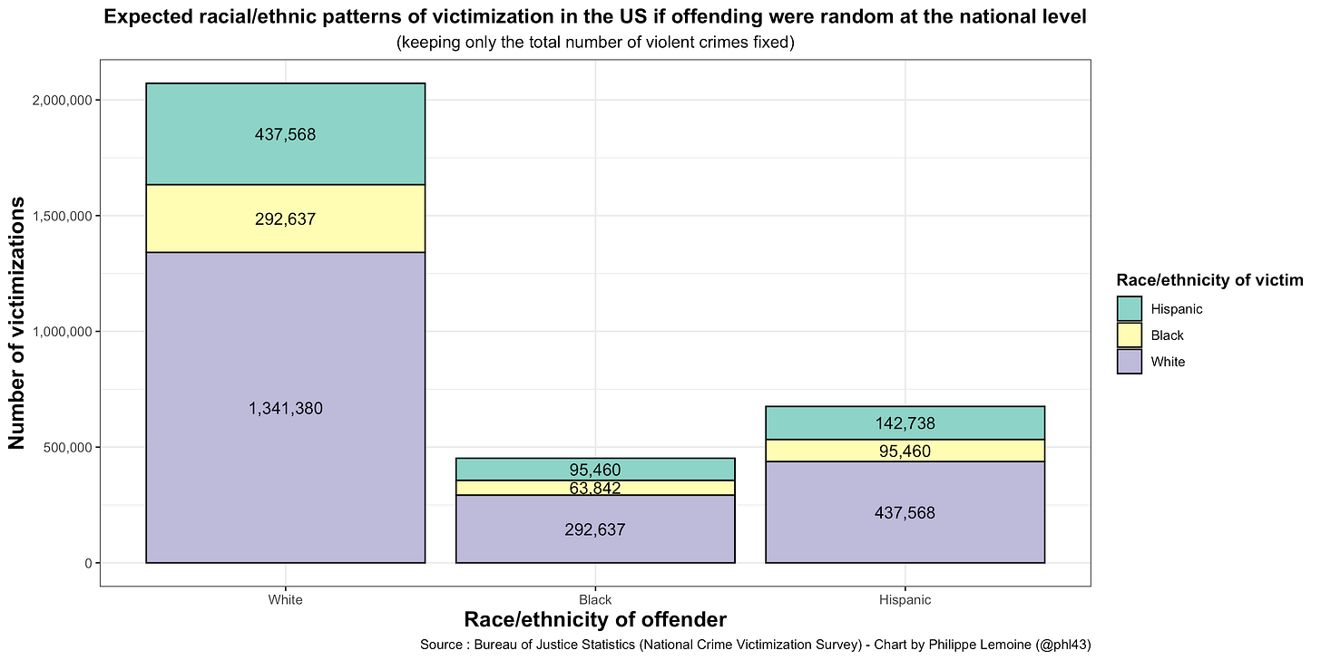 As you can see, this counterfactual is closer to the observed data than when you assume that criminals select their victims randomly at the national level, but the racial/ethnic distribution of victims is still very different. In particular, white people commit more than twice as many crimes against black people than in the actual world, while black people commit 19% less crimes against white people.