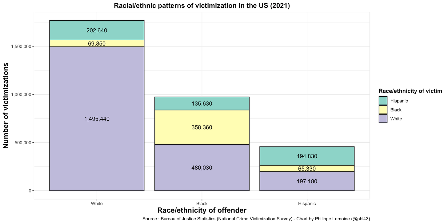 Now let’s go back to the original chart that Carr was criticizing. The point that it was making is that, if you listen to the media, you’d think that black people are much more at risk of being victimized by white people than the other way around, but in fact the opposite is true. Although it’s true that omitting intraracial crime from the chart painted a misleading picture of the racial/ethnic patterns of victimization in the US, that point on the other hand was perfectly correct. Indeed, according to the NCVS, a black person is 1/3 less likely to be victimized by a white criminal than a white person is to be victimized by a black criminal. Moreover, contrary to what Carr and other people suggest, this isn’t because there are more white people than black people in the US. In fact, if criminal behavior were distributed identically across races/ethnicities and criminals selected their victims purely at random among the people who live in their neighborhood, black people would be 4.5 more at risk of being victimized by a white criminal than white people would be of being victimized by black criminals.8 The reason why the opposite is true in the actual world is that 1) black people have a much higher offending rate than white people and 2) they seem to have a preference for white victims. Based on anecdotal and indirect evidence, this shouldn’t really surprise anyone, but race and crime is one of those subjects about which people are strongly enjoined to ignore what they see and plenty of people in the academia/media complex are making it easier for them by producing intellectual obfuscation to convince them there is nothing to see, which they buy all the more readily that they are desperate to believe it.