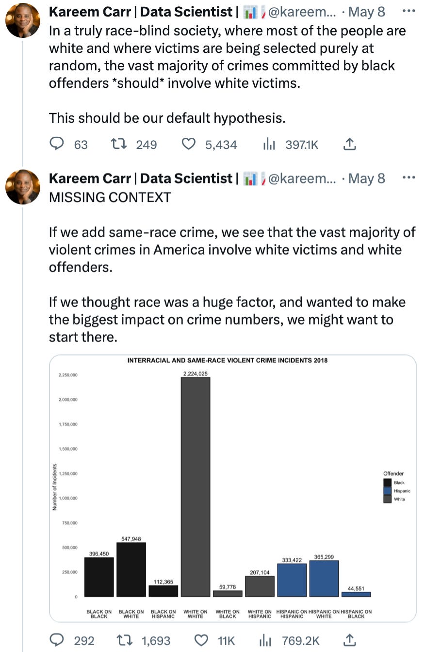 This prompted a response by Kareem Carr, a PhD candidate in biostatistics at Harvard, who argued that the chart was misleading. His main point is that while the chart makes it seem “as if black offenders are going out of their way to seek out white victims”, since white people are the majority in the US, you would expect the majority of crimes committed by black people to involve white victims even if criminals selected their victims purely at random. By the same token, you would expect white people to be victimized by other white people far more often than by black people, but the chart obfuscates this fact by only showing interracial violent crime and omitting intraracial violent crime. Carr shows that, when you use the same data that was used to make the original chart, this prediction is verified: