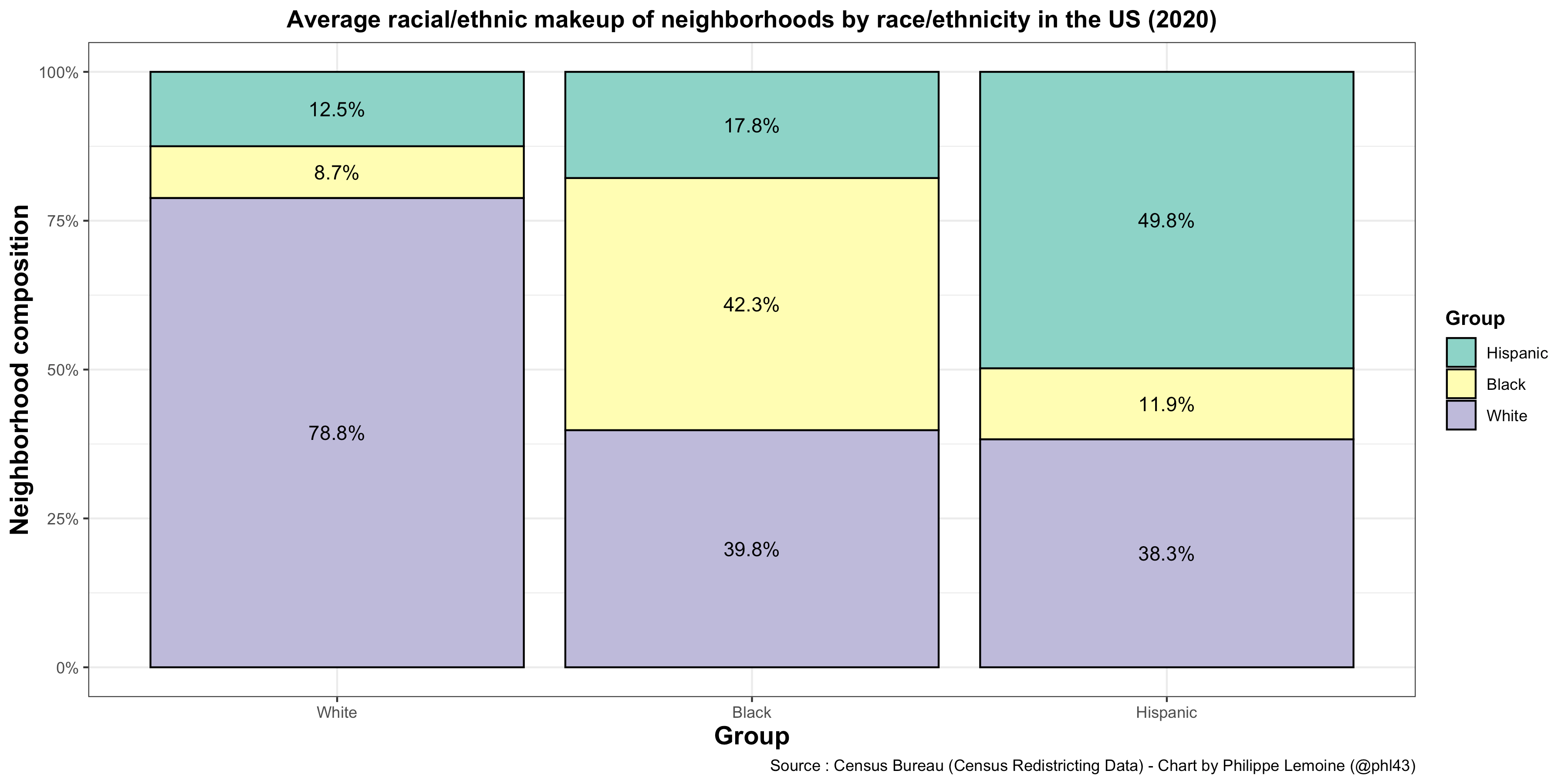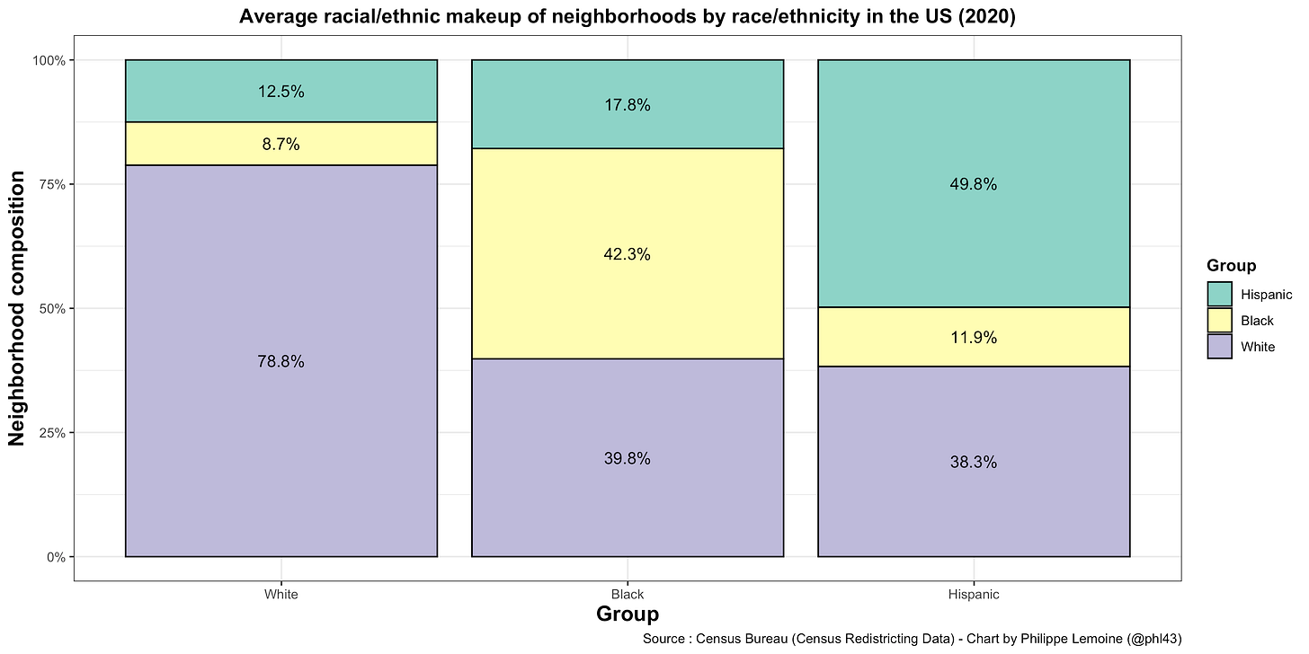 In order to create this counterfactual, I use data from the 2020 Census to compute what sociologists call “exposure indices”, which measure the racial/ethnic composition of the neighborhood of the average person of each racial/ethnic group.5 Here is what the average racial/ethnic makeup of neighborhoods by race/ethnicity in the US looked like in 2020: