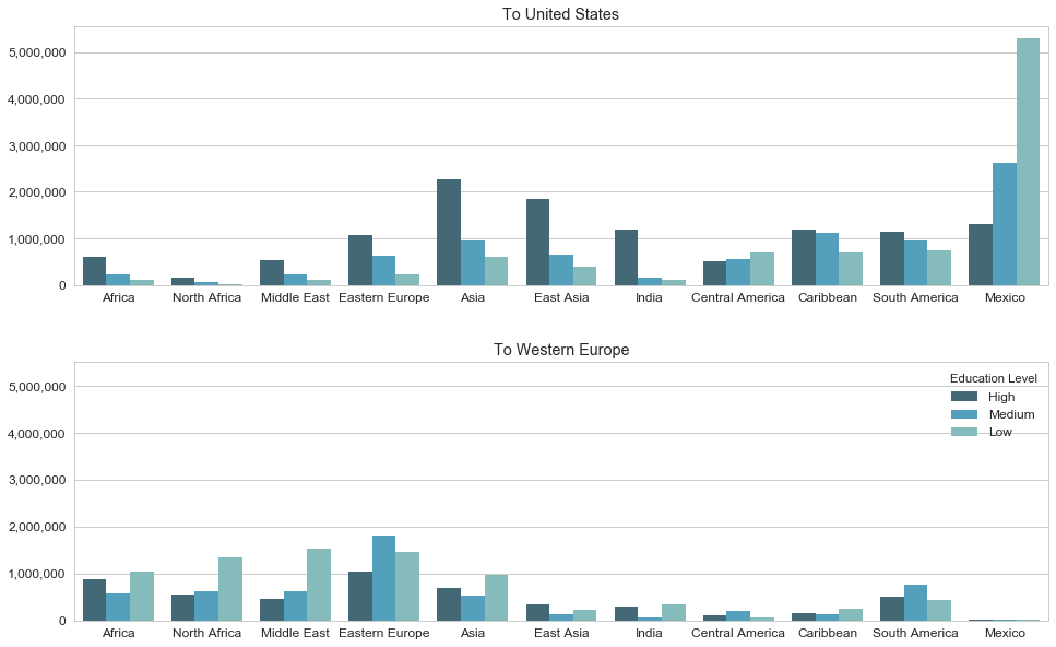 The education level are less than high school (low), high school (medium) and high (more than high school). As you can see, not only do immigrants in the US come from different regions than immigrants in Europe, but except for Mexican immigrants they tend to be much better educated.