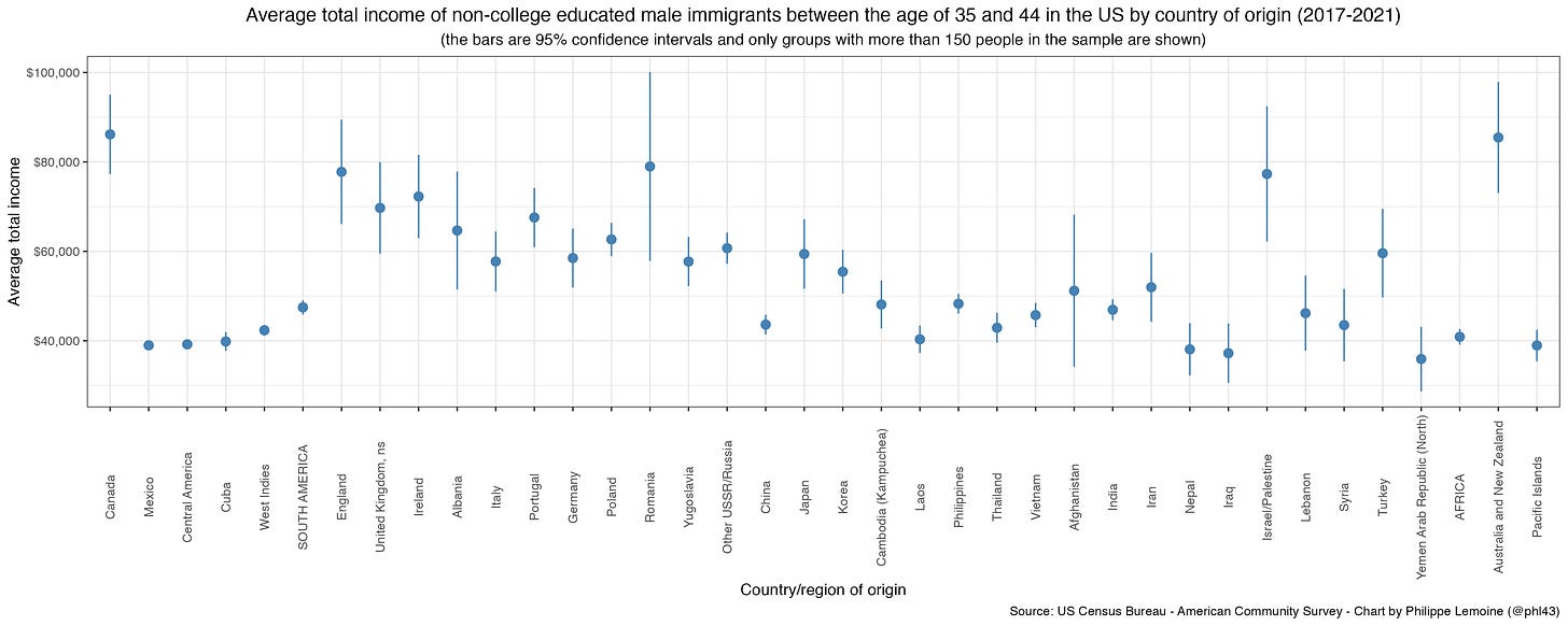 As you can see, even though in addition to restricting the sample to non-college educated immigrants I also eliminated the most obvious sources of confounding by looking only at men between the age of 35 and 44, there is still a lot of variation associated with country of origin.3