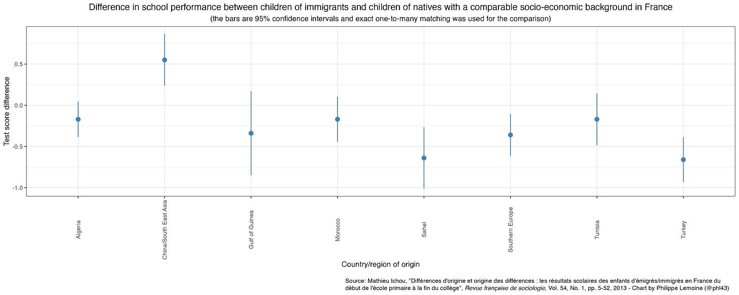 For another example, we can look at French data on how the children of immigrants do in school, which also show that a lot of variation in performance remains associated with country of origin even when you control for socioeconomic background. This chart shows the difference between standardized test scores obtained by children of immigrants and children of natives matched on various socioeconomic variables in a panel of 15-year old students in France: